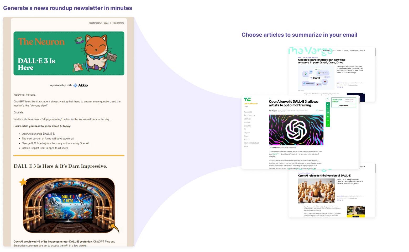 Effortlessly create news roundup emails that summarize the latest news on any topic and keep your audience informed and engaged.