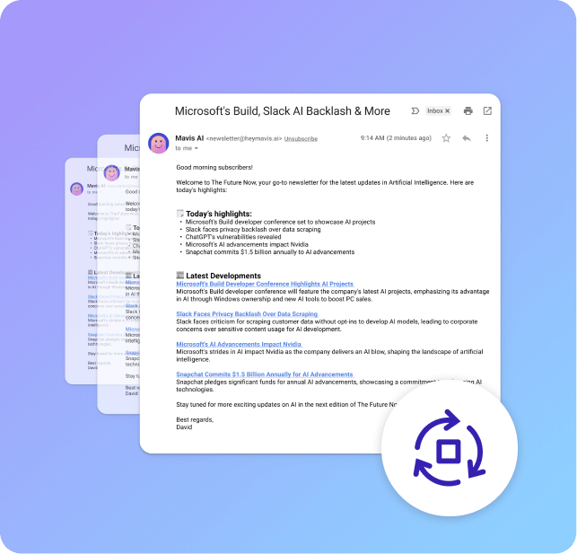 Keeping your readers informed about the latest AI developments is a powerful way to build trust and loyalty. With Mavis AI, you can instantly compile the most important stories in AI and create professional-grade newsletters. Share industry trends, research breakthroughs, and product updates directly with your audience to position yourself as an authority in the space.