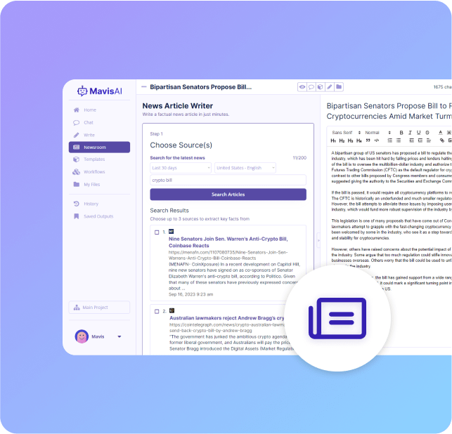 Give Mavis a topic and it will scan the web for the latest news around that topic and write an original news article about it.