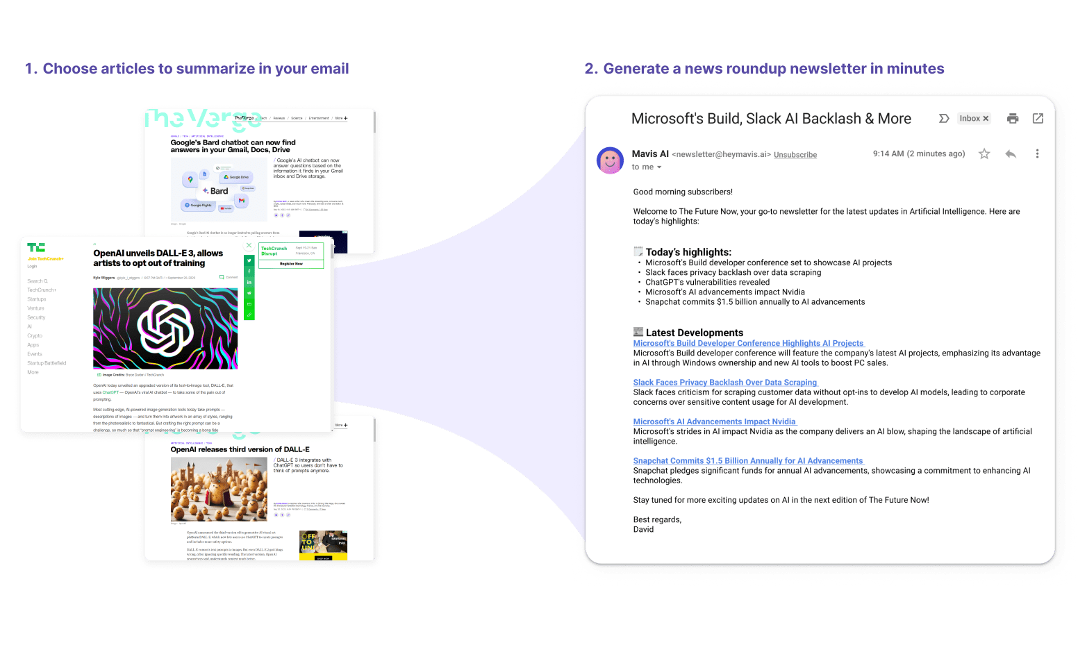 Mavis AI is the first AI writer that can take relevant news about any topic and turn it into an engaging roundup newsletter, like The Neuron, the Hustle, and other similar newsletters.