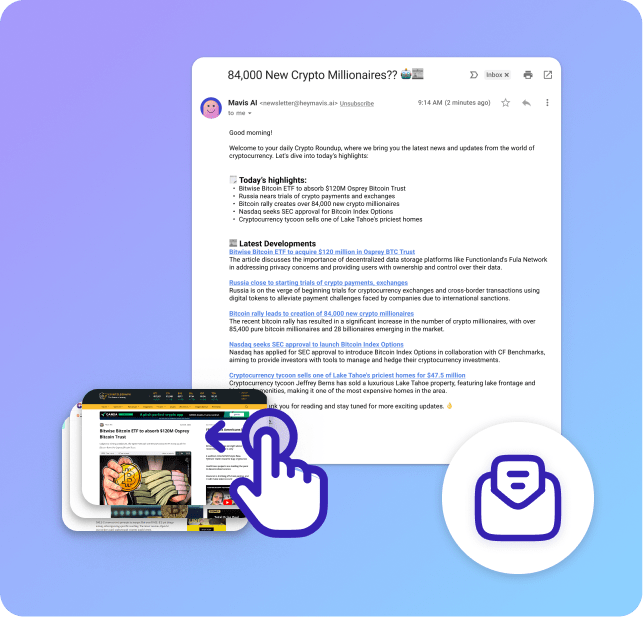 With Mavis AI, creating and scaling a profitable crypto news brand is simple. Automate your news articles, newsletters, and social media threads that keep your readers engaged.